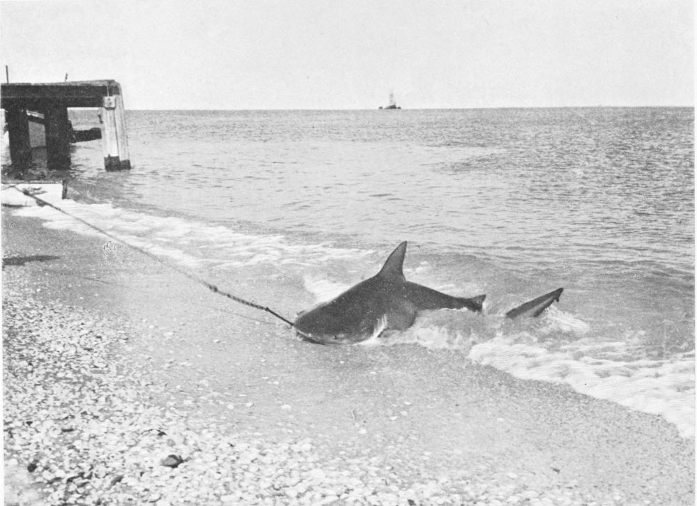 It is impossible to know how far one is drifting towards the open sea, and on all sides are heard the plunges of mighty fish, which are far more likely to land in the boat than during the day. A great tarpon may seize the bait and get round behind the angler, to his utter confusion. Even if the shore is reached in time, there is considerable difficulty and excitement in landing a tarpon on a dark night. Towards the end of May those who are not strong enough to land their tarpon without delay lose them to the sharks. As many as five of these monsters will attack a hooked tarpon at once, and on one occasion I remember four of them while thus engaged attacking a fifth, and in a few moments not a shred of that fifth shark remained. The angler recovered only the head of the tarpon. It is remarkable, seeing the position of the shark’s mouth, what rapid bites he can take at a struggling tarpon, just as we should take the first bite of a sandwich. It is no bad plan to carry a rifle in the boat so late in the season. It will often keep off sharks and save a good fish.