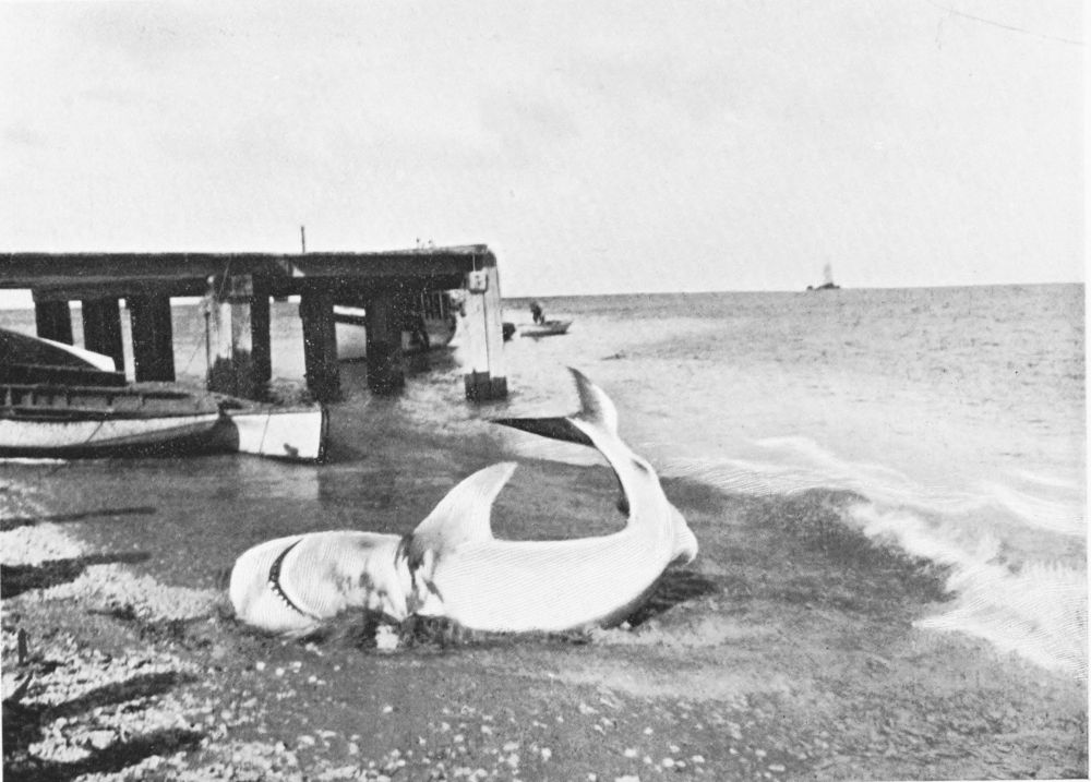 The infuriated fish tows the boat in all directions. It is too heavy to haul in, and must be got ashore. This is not very difficult, for you let it run free when heading in that direction, and check it when making a move for deeper water. At last it is beached. There is no occasion to cut out the harpoon, for all you need do is to thrust in your finger and press up the barb on either side, and it comes away at once.{94}