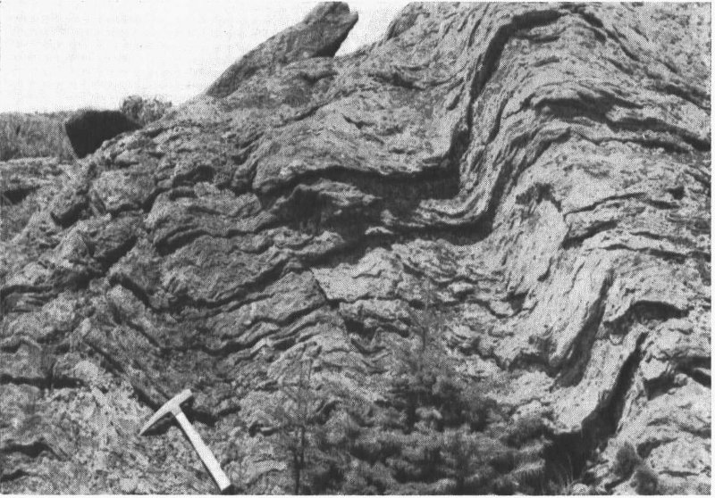 The smaller folds are like “little fleas on bigger fleas on bigger fleas” in that many little folds may be superimposed on larger ones. These anticlines and synclines range in amplitude from fractions of an inch to thousands of feet. Many are miniature anticlinoria themselves and could be used as scale models of the structure of the entire mountain range. The small folds, or crenulations, in the schist have weathered differentially so that the more resistant layers stand out in relief, emphasizing the shape of the folds. The photograph in Figure 4 shows the small-scale folding. It will be noted that the anticlinal folds are asymmetrical with the west side dipping more steeply than the east side.