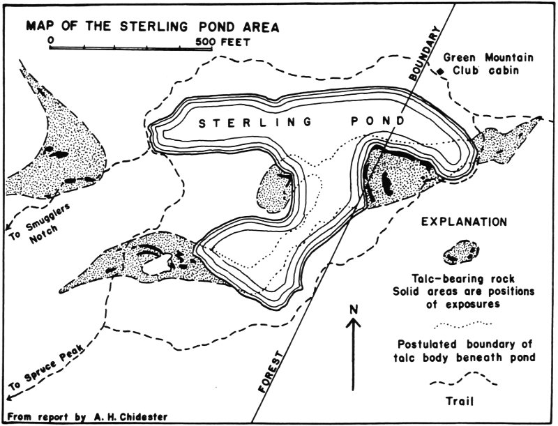 The Sterling Pond area contains talc deposits which probably would be commercial if they were not so inaccessible for mining. These deposits have been studied by A. H. Chidester of the United States Geological Survey and a report is obtainable from the U. S. Government. The occurrence of the talc, as mapped by Chidester, is shown in the sketch of Figure 8.