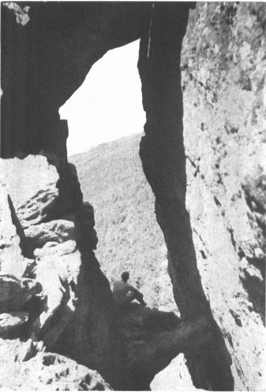 Between the Chin and Mount Mansfield Hotel are a number of interesting trails. The Subway and Canyon trail on the west side of the mountain follow, for part of the way, joints in the rock which have been enlarged by the downhill slippage of the western block. Figure 11 shows the nature of one of these passageways. On the east side of the mountain, the Cliff trail passes through a similar joint called “Wall Street.” The Cave of the Winds, reached by a trail just north of the Lower Lip, has formed along another north-south joint. The block which has moved downhill has tilted into the mountain and rubble has filled the gap at the top to form the cave. Figure 12 shows the appearance of the cave as seen from the eastern slope of the Chin. This photograph shows smaller joints on the Chin which have just begun to be enlarged by slippage of the downhill block. It is possible that some of these open joints date back and partially owe their origin to glacial erosive action.