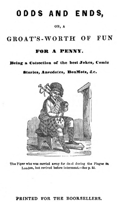 The incidents of Dougal’s official life being committed[17] to the keeping of tradition, have faded out of public memory with the generation whose sides were tickled by his jokes; but a list of his chap-books made by Motherwell, lets us see how he employed his literary leisure, and the date of publication of the last but one on the list, brings us to the date of his exit from the scene which his pen and his voice helped so much to enliven. It is generally agreed that “Jockie and Maggie’s Courtship” is the first of his original prose compositions; and that it was written some time after his having set up in business as a printer. He appears to have previously devoted his pen entirely to the service of the poetic muses; and is the originator of those comic, but harmless satires on the simplicity and imperfect English of Highlanders, of which his John Hielandman and Turnimspike are the prototypes. But, like his greater countryman, and it may be added, his greatest extinguisher, Scott—and much about the same age—after he had worked out the poetic vein, he discovered a prose one, equally prolific, and of richer ore; but of which, like the “Great Unknown,” he preferred to be the unknown excavator. It is an odd coincidence that, like Scott, too, he frequently wrote under cognomens, as John Falkirk, or The Scots Piper. The following is Motherwell’s list of his prose tracts, with the dates of the earliest editions which he was able to obtain:—Leper the Tailor, Part II. only, being a first edition.