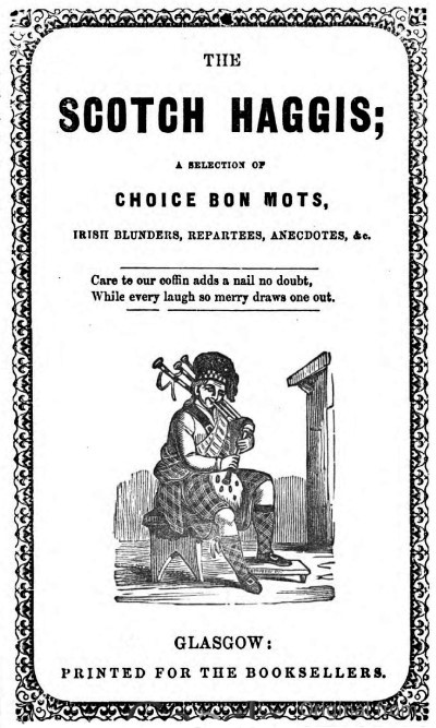 What Mr Fraser says as to their facetiæ—including that of Paddy from Cork—being found in the facetiæ[20] of almost every country in Europe, may be true—as Motherwell also states in almost the same words; but Mr Fraser does not contend for originality in the incidents, if the composition be imbued with the national spirit and adapted to the manner of thought and language of Scotchmen. George Buchanan is thoroughly Scotch in spirit, and its language is such as an ordinary Scotchman of common education would use in writing of events that happened out of Scotland, and where the use of his native dialect was inappropriate. The same may be said—of the language only—of Paddy from Cork, which Mr Fraser places under the third head, and we see no improbability in the composition of both tracts being Graham’s. Mr Fraser seems to forget that Dougal could write in other styles than that of Jockie and Maggie—that, no doubt, is his best—but his preface to the third edition of his History, Turnimspike, &c., and his denunciations of the Papists, display a versatility as to style which makes it difficult to except almost anything in chap literature from his authorship.