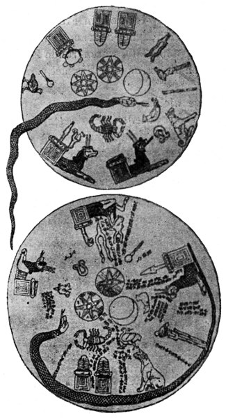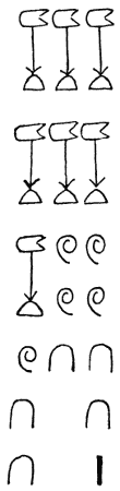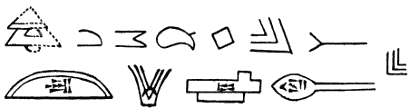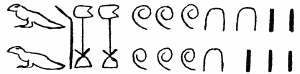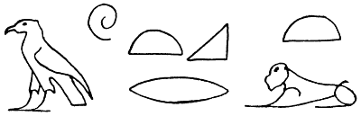 In jeder Hieroglyphe sah man ein Bild oder Symbol irgend eines tiefen Gedankens und suchte sie wie einen Rebus zu erraten.[S. 16] So las der bekannte viel wissende Jesuit Athanasius Kircher, der von 1601–1680 lebte und die Laterna magica u. a. erfunden hat, die sieben Zeichen: