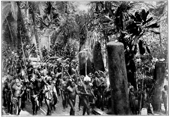 He then turned his attention to the ceremony. In a few moments a dozen savages took their places at the boo-boos and a few men started a half-hearted chant. A score of young savages began to dance, but without much spirit. It was half an hour before they warmed up, but at the end of that time the chant was loud and punctuated with blood-thirsty yells, and a hundred men were dancing in the clearing. I call the performance “dancing,” but it was simply a march, round and round, quickening gradually to a run punctuated by leaps and yells. Soon women and children came out of the jungle. That was a good sign. For the time being, we were in no danger.
