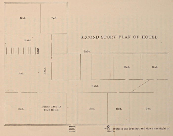 I propose to give a few illustrations of water pollution that are of a very marked character. The following diagram is that of a hotel in one of the thriving towns in this state, and the facts connected therewith I obtained from a reliable physician[9] under the promise of not giving to the public the locality or his name. I have seen the hotel myself, and assure you that the location was as represented.