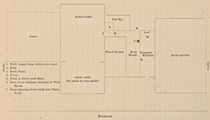 By the diagram sent, you will see that the well is under the L part of the house. The water is drawn up by means of a windlass in one of the back rooms. The well itself is some twenty-five feet deep. In the summer kitchen, not more than three or four feet from the well, you will notice the sink marked 2 on the diagram, which discharges its water on the ground by means of an open spout but a few feet from the outside of the building. At 3, about an equal distance from the well, is a back door, from which foul water, as on washing-days, and filth of nearly all descriptions, were usually thrown, which is not saying more than can be said of back doors to farm-houses in general.