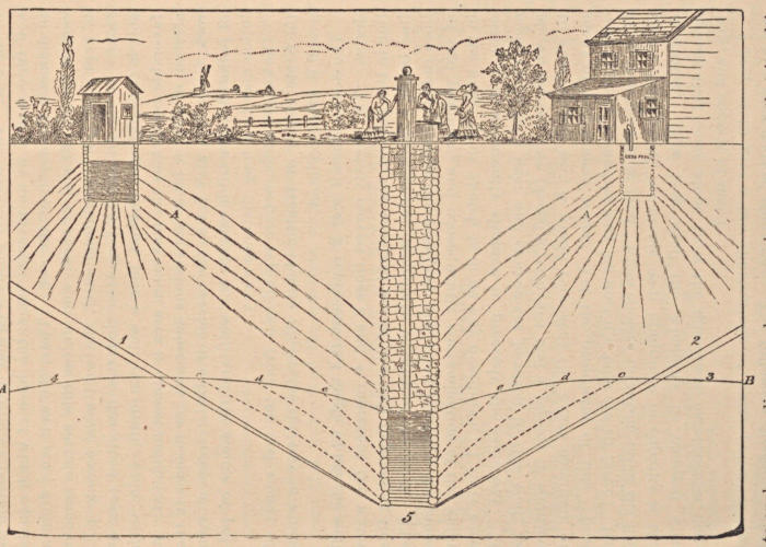 “We are often asked, In what way does the water of our wells, in farming communities especially, and in our larger villages,[6] become impure? It comes bubbling up from the deep fountains, fresh, cold, pure, and clear as the crystal, and often gives no indication by taste or smell of containing impurities. How often do we see the waste water from our kitchens thrown out upon the ground year after year, until the soil is saturated thereby? Then, again, the continuity of sink-drains, cess-pools, and privy vaults to our wells is sufficient to saturate the earth with their poisonous, disease-producing elements. It is through the agency of this apparently pure water, constantly, insidiously introducing these subtle elements into the human organism, that the fountains of life are poisoned and disease generated. In large towns and thickly populated streets, with slovenly domestics, the whole surface becomes saturated with the waste water, and in wet seasons the well, being the only artificial drainage, receives the drippings, converting it into a cess-pool of filth. I have known instances where the waste water from the sink-drain ran directly into the well, until the horrible stench compelled an investigation and a remedy. Instances of this kind are by no means rare, where a direct communication from the sink to the well is found to exist. With some families in the country the whole waste water of the household is thrown out upon the ground, until the entire surface soil is saturated like a sponge with the elements of disease. The popular but erroneous idea, that filling in earth upon a water-saturated soil removes the necessity of deep drainage, should be exploded from the minds of the people, and the great central fact set forth, that no water-saturated soil is fit for human habitation, and that a large proportion of unhealthfulness and human ailments can be traced directly or indirectly to this influence.”