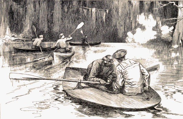 Knowing what anxiety his friends and Ko-wik-a's friends must be suffering on their account, Sumner determined to return to them at the earliest possible moment. The first signs of dawn, therefore, found the Psyche, with her crew and passenger, once more afloat. A hearty cheer followed the brave little craft as she glided away[Pg 315] from the great ship, and in less than an hour she was paddled gently up to where the other canoes and the cruiser lay on the beach.