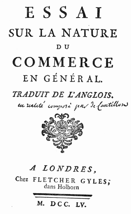 The Essai was written by Cantillon in English, and by himself translated into its present form for the use of a French friend. The original English work, with its statistical supplement, was never published. It was possibly in the possession of Philip Cantillon, a second cousin, when he brought out The Analysis of Trade, London, 1759, professedly based upon it. The fictitious imprint “A Londres, Chez Fletcher Gyles, dans Holborn, M.DCC.LV.” appears also upon the title-page of Questions importantes sur le Commerce, a French translation by Turgot of Tucker's Reflections on the Expediency of a Law for the Naturalization of Foreign Protestants.