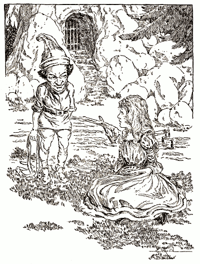 Now, you have heard of Rumpty-Dudget before, and therefore you know that this strange little gray dwarf was none other than he, and that, although he smiled so good-naturedly from ear to ear, he was really wishing to do the children harm, and even to carry one of them off to his tower, to stand in the thousand and first corner. But he had no power to do this so long as the children stayed on their side of the hedge; he must first tempt them to creep through the round opening, and then he could carry them whither he pleased. So he held out his hand and said: