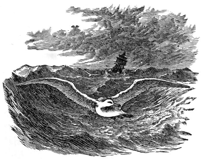 It often follows ships for a long time; day after day, some people say, but this is doubtful. No ship can outsail it and it is said to be able to fly as much as eight hundred miles in a day. Sailors often fish for it with a baited hook, but find it hard to haul in, as it often draws out the hook or breaks the line. But a bait of blubber is very attractive and in a few minutes the same bird will take the hook again. Only by catching a fish in some such way as this could a message tied to its legs by shipwrecked sailors be found.