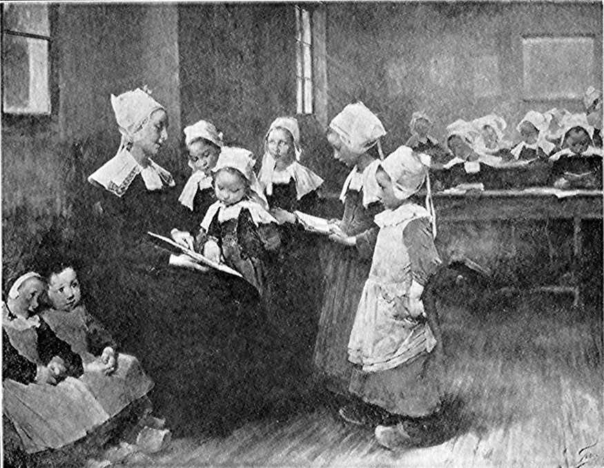 Questions to help the pupil understand the picture. How many have ever visited a country school? a city school? In what ways do they differ? How are they alike? Which does this picture represent? Why do you think so? Where is this school? Who lives near it? What does he like to do? What does he do for the children? How do the children dress in Brittany? Why do most of them come a long distance to school? Tell about the old 18castles; the forests and the Druids. Which class is reciting now? Tell what each one of the pupils is doing. Tell about the children at the desks. Why must they study so hard? What do you think they will all do at recess? What makes you think this is a quiet, orderly schoolroom? Look at the picture, then close your eyes, and then open them slowly. Whom do you see first? Whom do you think the artist intended us to see first? Why did he paint the children in the background so indistinct?