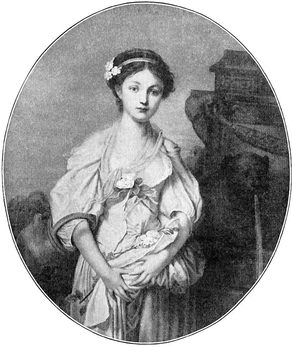 One evening she dressed her little daughter in a ragged dress and bonnet to make her look like a poor peasant child. She herself wore an old dress, with a handkerchief over her head to hide her face like a veil. They slipped quietly out of the house and into an omnibus that was waiting for them and drove as quickly as possible through the crowded streets, out of the city. No one recognized them, and they went to Italy, where they traveled about the country for many years. Mother and daughter were very popular and were entertained royally wherever they went. But Madame Lebrun never laid aside her painting. Even when she was eighty years old she painted a beautiful portrait of her little niece, who must have reminded her of the little daughter in this picture.