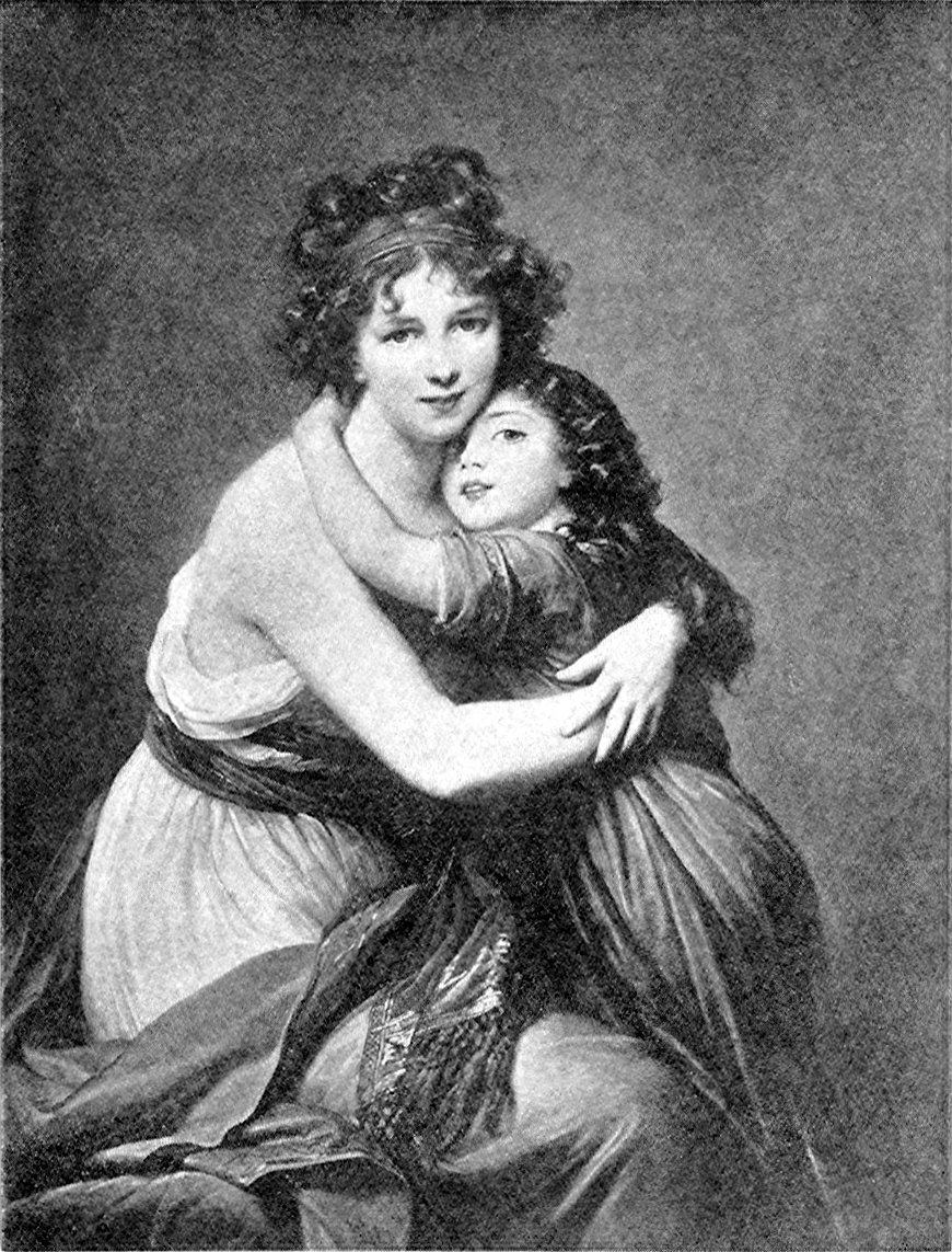 38Madame Lebrun had been planning for some time perhaps to paint a portrait of herself. Then, just as she was all ready and seated in front of a long mirror, the door had opened suddenly and in had come her little daughter. With a hop and a jump she had thrown herself into her mother’s arms. Then with her arms still about her mother’s neck, she had happened to think of the mirror, and half turning there she had seen herself held close in her mother’s embrace. Madame Lebrun realized at once what a lovely picture it would make, and so she began to paint it.
