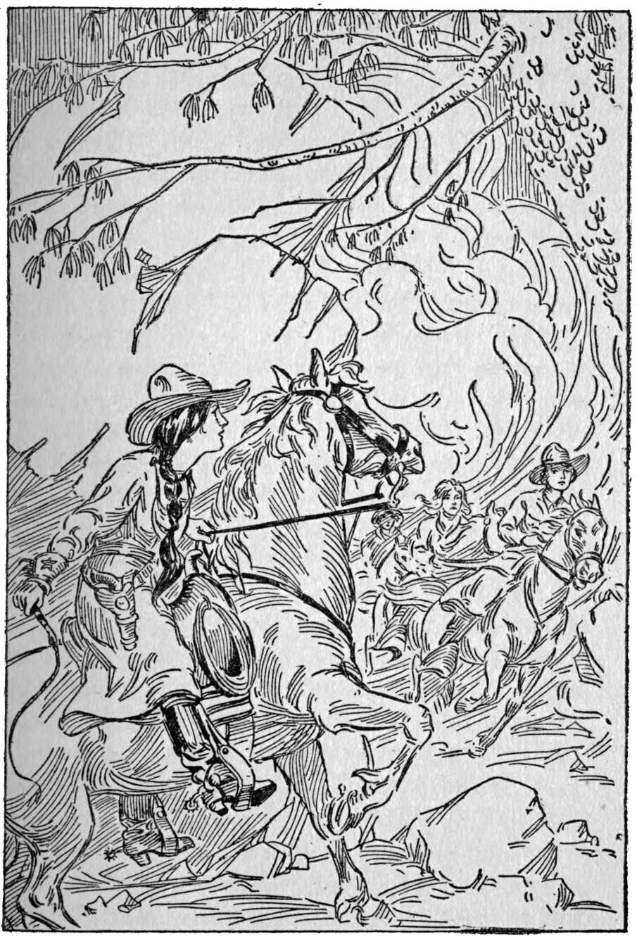 Overland girls go in search of the missing ones. Judy Hornby leads the way. The mountain cabin found to be empty. Bindloss reads the trail. Startled by the sound of shots. The worst is feared. “Fire! They’ve set the grass on fire!”