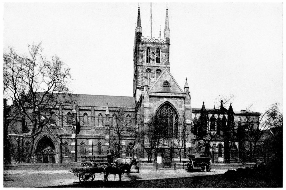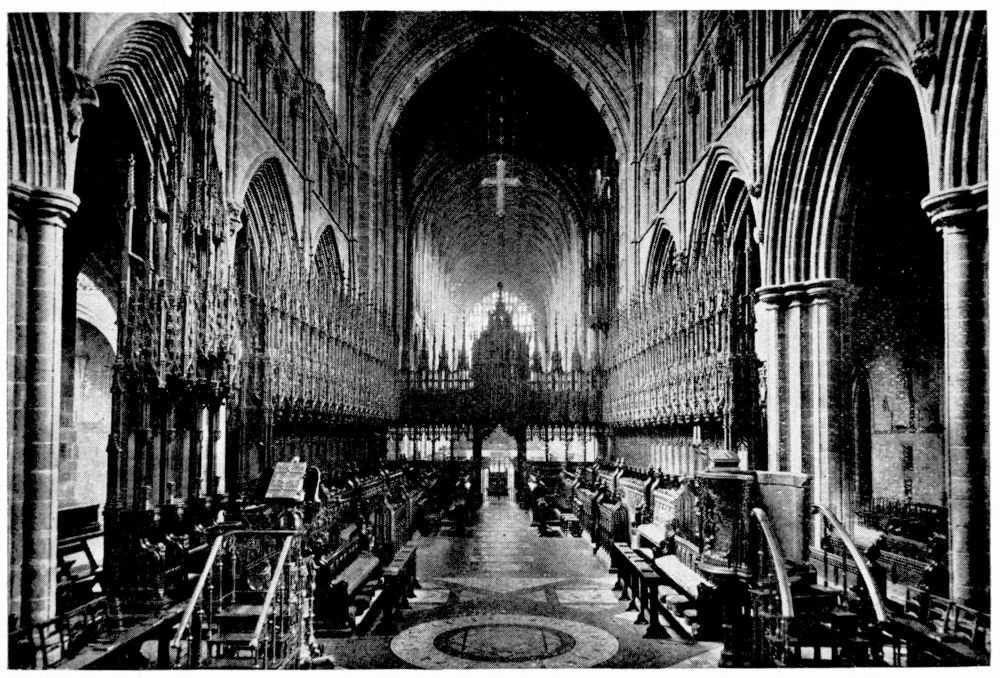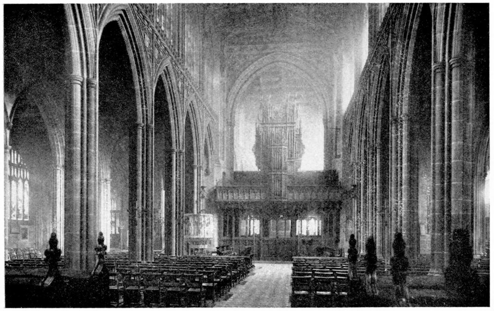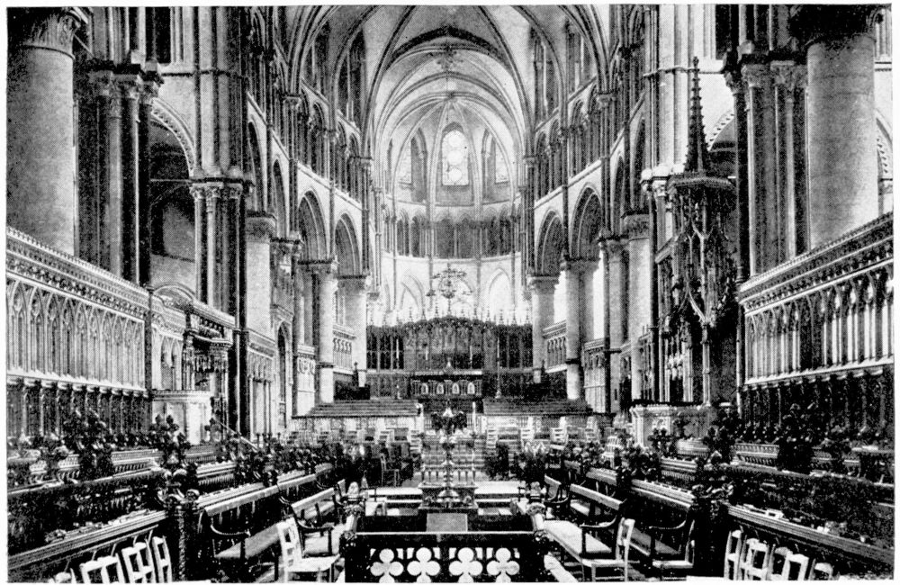 “As we see our cathedrals now, the view that meets us differs much from that which would have greeted us in mediæval times. Then all was ablaze with colours. Through the beautiful ancient glass the light gleamed on tints of gorgeous hues, and rich tapestries and hangings, on walls bedight with paintings, and every monument, pier and capital were aglow with coloured decorations. We have lost much, but still much remains. At the Reformation the avaricious courtiers of Henry VIII. plundered our sacred shrines, and carried off under the plea of banishing superstition vast stores of costly plate and jewels, tapestry and hangings. In the Civil War time riotous, fanatical soldiers wrought havoc everywhere, hacking beautifully-carved tombs and canopies, destroying brasses, and mutilating all that they could find. Ages of neglect have also left their marks upon our churches; and above all the hand of the ignorant and injudicious ‘restorer’ has fallen heavily on these legacies of Gothic art, destroying much that was of singular beauty, and replacing it by the miserable productions of early Nineteenth Century fabrication.”—(P. H. D.)