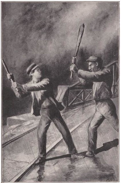 “He’s th’ lazy hound that Jack fired from th’ gang this mornin’,” answered Reddy, his blue eyes blazing with unaccustomed wrath. “He’s a reg’lar bad ’un, he is. We used t’ think he was workin’ like anything, he’d git so red in th’ face, but come t’ find out he had a trick o’ holdin’ his breath t’ make hisself look that way. He was allers shirkin’, an’ when he had it in fer a feller, no trick was too mean or dir-rty fer him t’ try. Y’ remimber, boys, whin he dropped that rail on poor Tom Collins’s foot?”