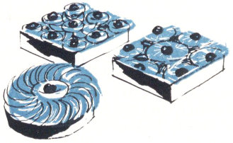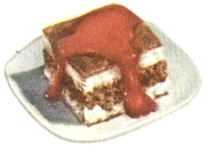 Broiled Topping: Mix ⅓ cup soft butter, ⅔ cup brown sugar (packed), ¼ cup cream, 1 cup Wheaties or coconut, ½ cup chopped nuts. Spread on warm cake. Place about 3″ under broiler (low heat) until mixture bubbles and browns (3 to 5 min.). Do not burn!