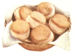 Make Biscuit dough (p. 3). Roll ¼″ thick. Cut with 2½″ cutter. Butter lightly and fold in half. Place close together in ungreased round layer pan or square pan. Bake 10 min.