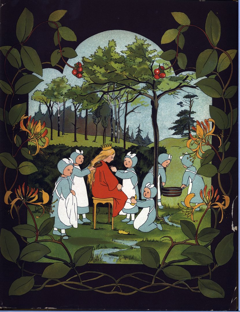 When school was out, the little Princess wandered happily through the wood. A gentle fawn came springing over the lawn and walked beside her for a while. Seven frolicsome hares hopped and nibbled and played about the path. Whisk, the squirrel, and his mate followed too and stopped sometimes to eat a juicy blackberry. The birds flew and sang above them.