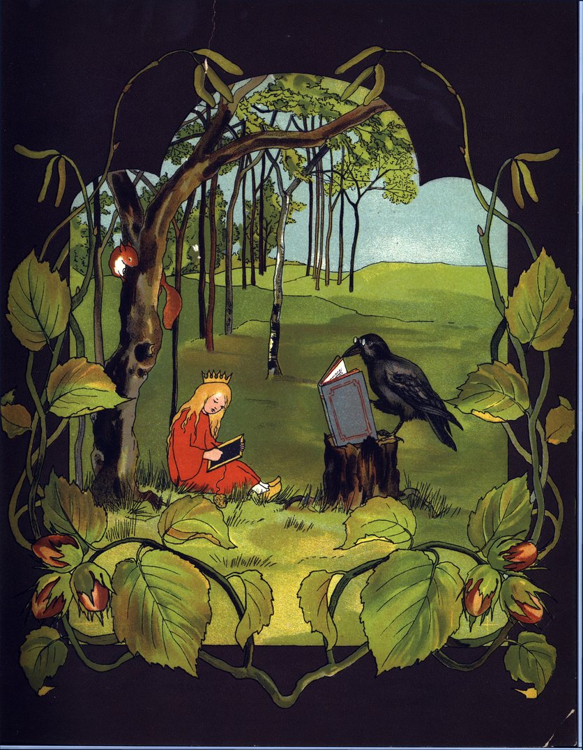 After breakfast Master Crow flew down with specs on beak and book under wing. He gave the little Princess a pencil, and a slate with a golden rim, and told her to sit on the grassy bank under a tree. Then Master Crow perched on a stump and opened his book with a “Caw, caw, caw!” He taught the little Princess to spell such words as SPRING and BIRDS and NESTS and EGGS. It was the nicest school she had ever heard of.