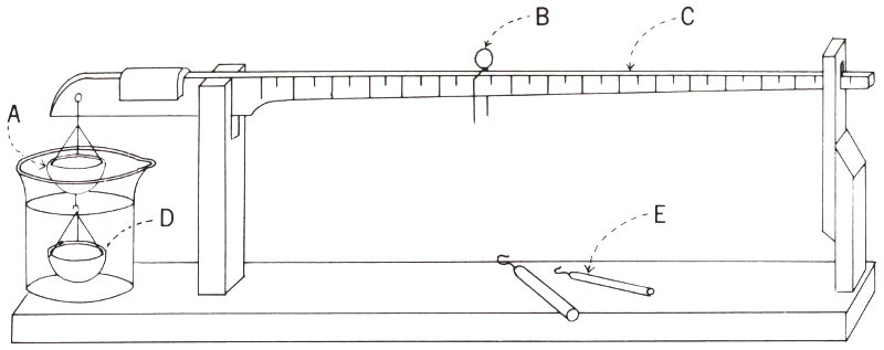 Sketch of a simple balance used to determine specific gravity of a gemstone. The operator places the gemstone in the upper pan (A), moves the weight (B) along the beam (C) until it balances perfectly, and notes the number at the weight’s position. He then transfers the gemstone to the lower pan (D), which is completely immersed in water, and moves the weight along the beam to restore balance. He notes the scale number at the new position and determines the specific gravity simply by dividing the first number by the difference between the two numbers. If the gemstone is large, the operator can use heavier sliding weights. (E).