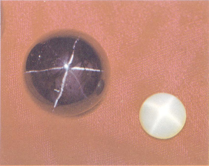 Asterism (star effect) is caused by parallel inclusions arranged in several directions related to the crystal structure of the gemstone. Two rays in the 175-carat, 6-rayed star garnet from Idaho (at left in photo) are weaker than the other four because of fewer inclusions in that direction. The 23-carat star orthoclase from Ceylon shows brightly all of its four possible rays. (Actual size.)