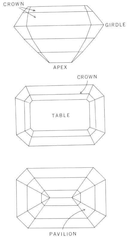 The emerald or step cut provides a large table and a full bottom for the stone. Although the number of crown and pavilion facets may vary, the general pattern is maintained.