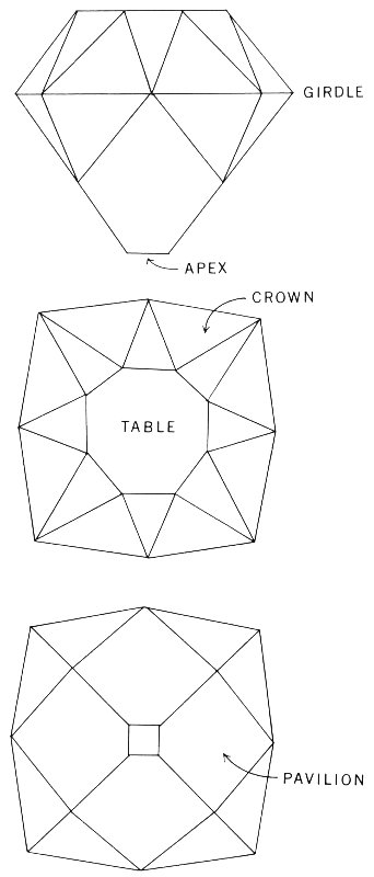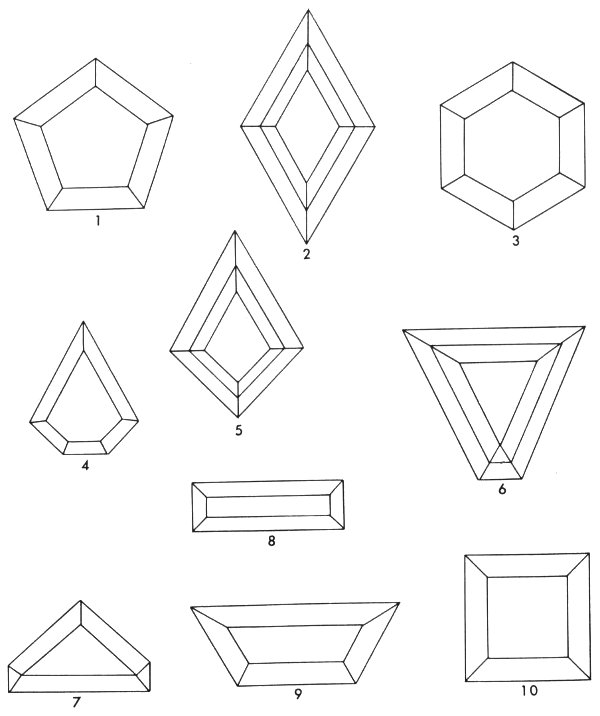 Various kinds of cuts have been devised for special purposes in jewelry design. These include the pentagon (1), lozenge (2), hexagon (3), cut-corner triangle (4), kite (5), keystone (6), epaulet (7), baguette (8), trapeze (9) and square (10).