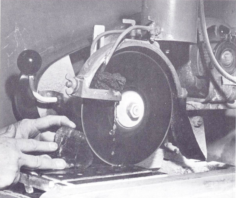 With this typical trim saw, water is used as a coolant for the rapidly rotating metal disk, which has a diamond-impregnated rim. Here, the blade is cutting its way through a piece of gem tourmaline.