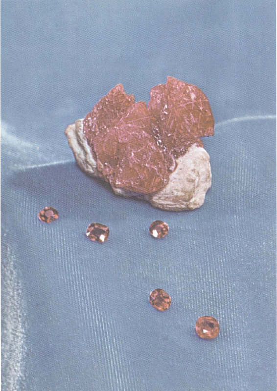 The kunzite and hiddenite varieties of spodumene show strong pleochroism, or the ability to show three different colors when viewed in the direction of different axes. Some of the large Brazilian kunzite crystals mined in the early 1960’s have 62 an intense rose-violet color when viewed along the long axis of the crystal but have pale blue-violet and pale tan colors when viewed from the other two directions. When heat treated, or exposed to strong light, this Brazilian kunzite loses its tan and bluish colors but retains the intense rose-violet. Because of spodumene’s pleochroism, the direction of cutting in the stones becomes extremely important, as it must be done in a manner that will take advantage of the violet color in kunzite and the green color in hiddenite.