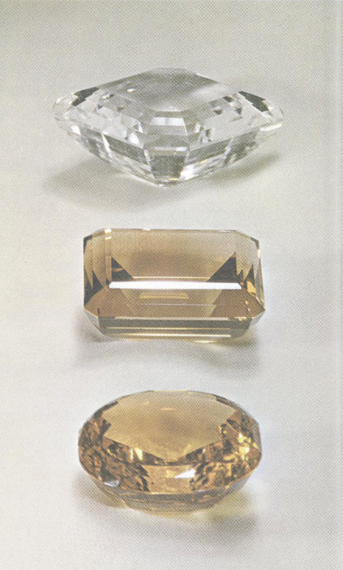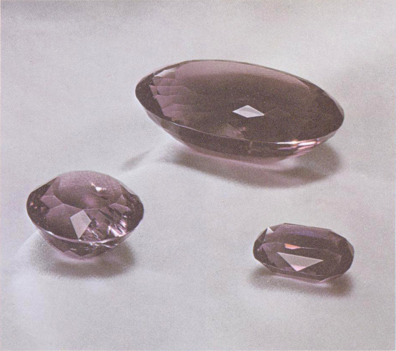 Pastel rose quartz has a delicate beauty in any cut. The 375-carat step cut (top), the 84-carat step cut, and the 46-carat marquise came from Brazil. (Two-thirds actual size.)