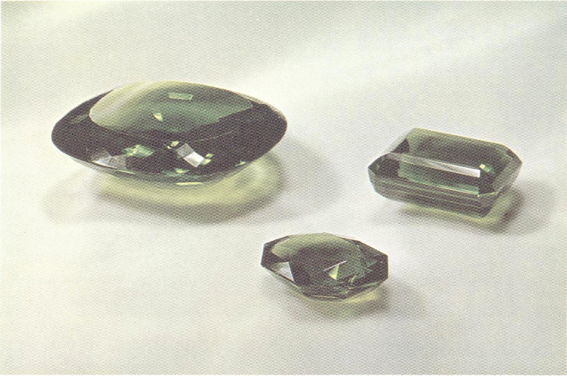 To exhibit its unique color to best advantage, peridot usually is cut so as to have a relatively large table, as shown in these examples. The largest gem, weighing 310 carats, is from the Egyptian island of Zebirget in the Red Sea and is the largest cut peridot known. The other two, weighing 287 carats and 109 carats, are from Burma. (Three-fifths actual size.)