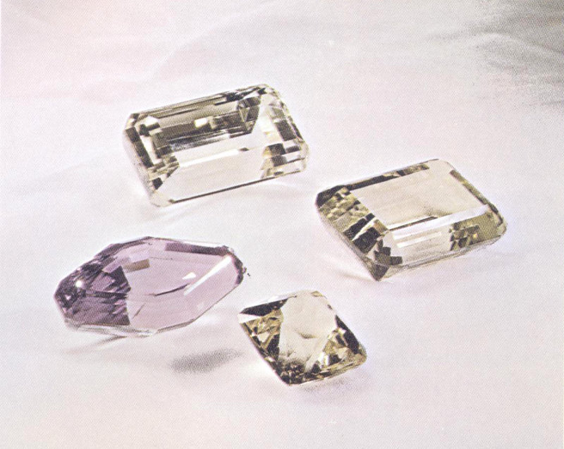 A 783-carat step-cut citrine of deep, rich color dwarfs a 278-carat brilliant-cut citrine (at left), a 90-carat smoky quartz, and a 91-carat briolette of citrine. The smoky quartz, from Switzerland, is so dark that it appears to be opaque. The other three stones came from Brazil. The briolette and brilliant-cut citrines were cut and donated to the Smithsonian Institution by Albert R. Cutter. (Slightly less than half actual size.)