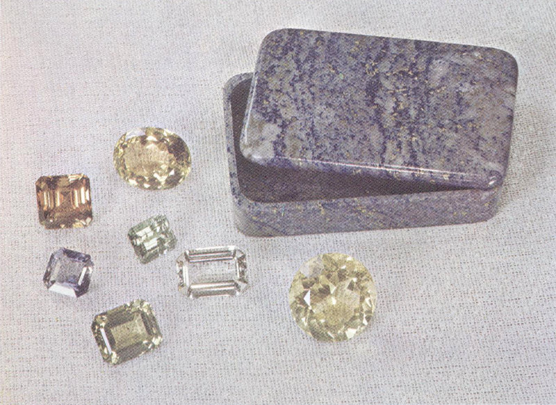 Exotic gems that represent collectors’ items lie beside a 3¼-inch-long box of Russian lapis lazuli. The stones are (left row, from top) a 28-carat andalusite from Brazil, gift of Fred C. Kennedy, a 10-carat cordierite from Ceylon, a 29-carat apatite from Burma, and (right row) a 42-carat brazilianite from Brazil, a 13-carat euclase from Brazil, a 29-carat wernerite from Brazil, and a 61-carat orthoclase from Madagascar.