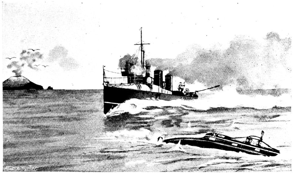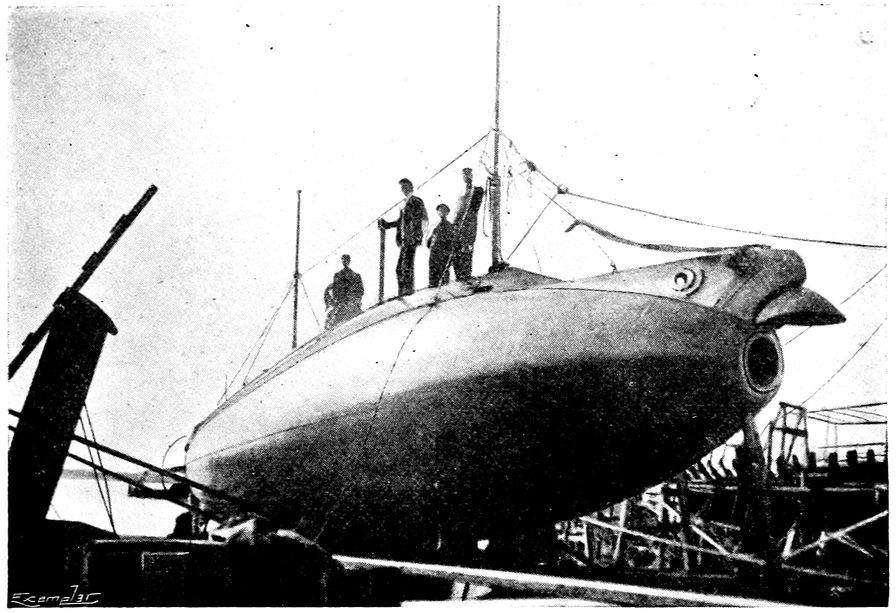 This vessel was named after its designer Don Isaac Peral, a Spanish lieutenant, on whom, in reward for his labours, the Spanish Government conferred titles of nobility and an indemnity of 500,000 francs. It was constructed at the Arsenal of Caraca, and launched on October 23, 1887. It measured 72 feet from stem to stern, and was 9 feet in beam. The motive power was furnished by two electric motors of 30 h.p. each driving two screws; 600 accumulators supplied the power for all purposes. During its trials in 1889 the Peral was ordered to proceed to sea to blow up an old hull placed at a distance of some two or three miles from shore in Cadiz Bay, running a long distance under water in search of the supposed ironclad. The boat was subsequently reported to have successfully accomplished this feat, and, as a consequence, the Spanish Government would, it was said, order several vessels of this type for the defence of the coasts of the Peninsula. A public subscription was started in Spain. For a time great enthusiasm prevailed, but as Spain made no use of the Peral during the Spanish-American War it may be presumed that the interest in under-water vessels soon died out. On the 28th of June, 1890, a night attack was made by the Peral against the cruiser Colon. The latter, in spite of its powerful electrical projectors, failed to pick out the submarine, which advanced within 10 metres of the cruiser to discharge its 316torpedo. During the year 1898 several accounts appeared in the papers relating to a wonderful submarine which the Spanish Government was said to have purchased. It consisted of a large steel sphere, so solidly constructed that it could resist the pressure of the water no matter at how great a depth. Its exterior diameter was 9 feet 9 inches, and the shell measured 4 inches in thickness. It weighed 10 tons, and contained sufficient air for a crew of three for 48 hours. Electric accumulators drove it at a speed of 4 to 5 knots. It was suggested that the submarine might be connected by an electric cable with a battleship and a cruiser, thus enabling them to steer a safe course through a channel laid with mines.
