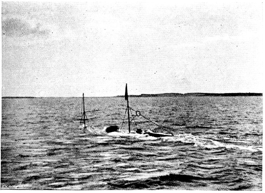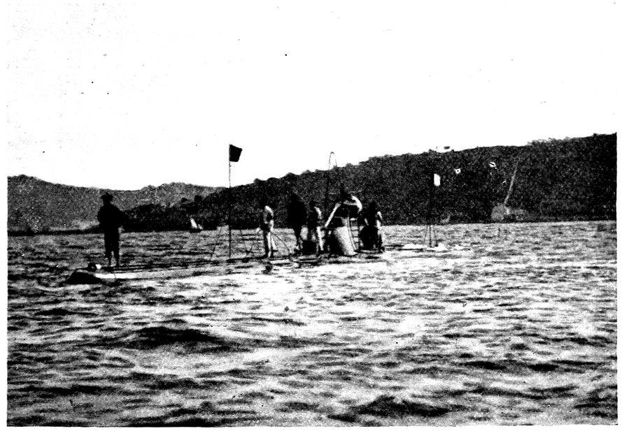 It might prove interesting to copy one day’s experiences from our log-book. This day we submerged for the purpose 325of discovering how much weight was necessary to prevent the current from moving the Argonaut in a strong tideway (Hampton Roads), and also to discover if there was any difference in starting our machinery again under water after it had been shut down for several hours. I copy verbatim from the log-book under date of July 28, 1898:—