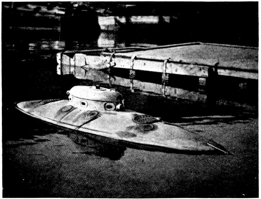 The hull of the vessel is mounted on three wheels. Of these E is the rudder, for surface steering, and is also the guiding wheel when the vessel is running on the sea bottom; and C is one of the supporting and driving wheels, of which there are two, one on each side. BB are two anchor weights, each weighing 1,000 pounds, attached to cables, and capable of being hauled up or lowered by a drum and mechanism within the boat: 0000 are water-ballast compartments contained within the boat; H is the diver’s compartment, situated forward, with an exit door opening outward in the bottom; while G is an airlock. When it is desired to submerge the vessel, the anchor weights BB are first lowered to the bottom; water is then allowed to enter the water-ballast compartments until her buoyancy is less than the weight of the two anchors, say 1,500 lbs.; the cables connecting with the weights are then wound in, and the vessel is thus hauled to the bottom, until she comes to rest on her three wheels. The weights are then hauled into their pockets in the keel, and it is evident that she is resting on the wheels with a weight equal to the difference between her buoyancy with the weights at the bottom, and the weights in their pockets, or 500 lbs. Now this weight may be increased or diminished as we please, either by admitting more water into the ballast tanks or by pumping 322some out. Thus it will be seen that we have perfect control of the vessel in submerging her, as we may haul her down as fast or as slow as we please, and by having her rest in the bottom with sufficient weight to prevent the currents from moving her out of the course, we may start up our propeller or driving-wheels and drive her at will over the bottom, the same as a tricycle is propelled on the surface of the earth in the upper air. In muddy bottoms, we rest with a weight not much over 100 lbs.; while on hard bottoms, or where there are strong currents, we sometimes rest on the wheels with a weight of from 1,000 to 1,500 lbs. Thus the effect of currents and wave motion, and the maintenance of trim and equilibrium are not factors in the successful navigation of the vessel; in fact, navigation becomes surer on the surface, as one is travelling in a medium which does not constantly change like the surface water from the effects of winds, waves, and currents. When the divers desire to leave the vessel they go into the diver’s compartment, located in the forward portion of the ship, and close the door communicating with the living quarters. This door closes on rubber packing, and is air-tight. Air is then admitted into the compartment from compressed-air reservoirs, until the pressure of air equals that of the surrounding water. The bottom door may then be opened, and no water will come into the boat, as the pressure of air contained within the compartment offers an invisible barrier to its entrance, and the divers may pass in and out as frequently as they please. The Argonaut is fitted with a White and Middleton gasoline engine of 30 h.p., which operates the screws the driving wheels, the dynamo, the air compressors, anchor hoists, and derrick-operating machinery. She is provided with two Mannesmann steel tubes, in which sufficient air may be stored, with what is contained in the boat, to last the crew for twenty-four hours without obtaining a fresh supply from the surface. In the Argonaut, however, and probably in all such craft used for commercial pursuits, as a 323usual thing, there will be a connection with the surface, through which a constant supply of air may be drawn, either by the masts, as shown in the views, one of which supplies air to the interior of the vessel, the other being utilised as an exhaust from the engine, or through suction hose extending to a buoy on the surface. While the engine is running there is about fifty cubic feet of air flowing into the boat per minute; and when the engine is closed down there may be a flow of air maintained by an auxiliary blower, so that it is possible to remain below for days, or even weeks, at a time.