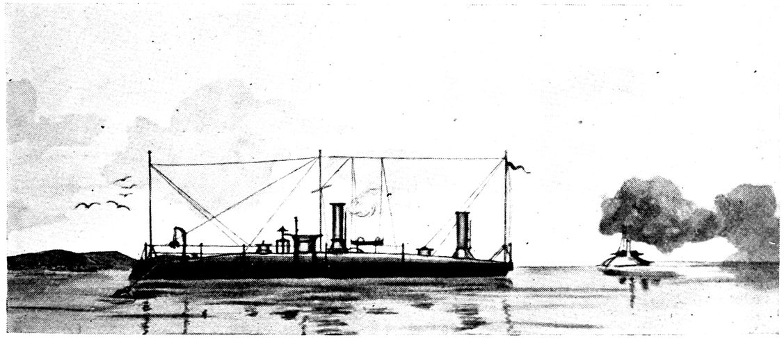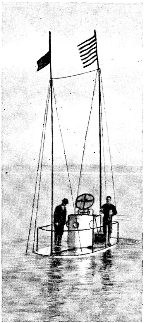 The Intelligent Whale was built at Newark in 1872 from the designs of Mr. Halstead. Its novel features were two doors in the bottom through which divers could leave the boat when submerged. On one occasion the boat went down in 16 feet of water and General Sweeney, clad in a diver’s suit, passed out through the bottom manhole, placed a torpedo under a scow anchored there for the purpose, and after entering the boat and moving away to a safe distance, 313exploded the torpedo by a lanyard and friction primer, and blew the scow to pieces.