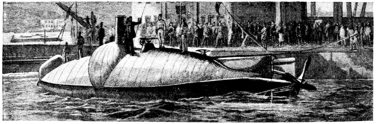Last year the construction of a submarine boat, designed by Lieutenant Kolbassieff and Naval Engineer Konteinikoff, was begun at Cronstadt. She is cigar-shaped with a piece cut-away along the upper part. On the sides forward there are blades which are used in sinking or raising the boat.