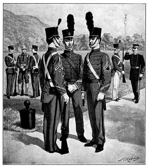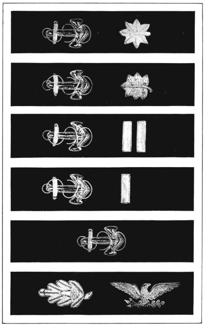 The great Civil War called such large bodies of men to the colors of the two contending sides that the question of economy demanded that the service uniforms for each side be made of one standard color and style, the armies of the North wearing blue and those of the South wearing gray. In each army, however, the different corps were distinguished by a distinctive color for the trimmings or “facings,” a custom which still prevails for the dress uniforms of our troops.