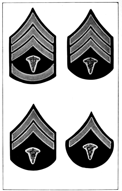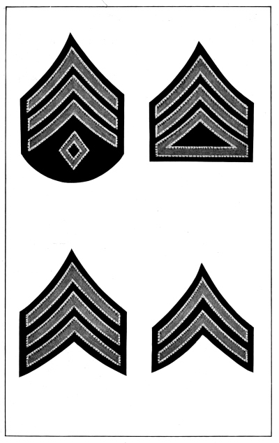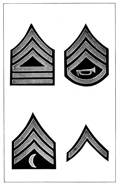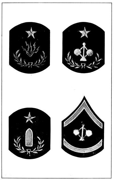 The Army is divided into various arms or corps according to the duties required, as follows: infantry, cavalry, field artillery, coast artillery corps, engineer corps, signal corps including aviation section, quartermaster corps, ordnance corps, judge advocate’s corps, inspector general’s corps and medical corps. Each of these arms or corps has a distinctive badge to be worn on all uniforms and a distinctive color for the facings and trimmings of dress uniforms, as described and illustrated in Chapter IV.