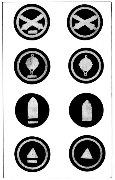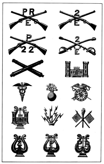Such regimental badges, founded largely upon sentiment but still appealing mightily to the imagination of the young recruit that joins the colors with the high heart of youth, are a great aid to discipline and efficiency, since discipline means the implicit obedience on the part of every one in the service to the orders from higher authority in such a manner as to secure the greatest cohesion and coordination and hence the greatest effect. These little metal badges bearing the symbols [Pg 6] and mottoes that bring daily to the minds of their wearers the valorous deeds that their regiment has done in the past arouse the spirit of emulation and competition, the desire to fight as well or better than the old regiment fought on some other bloody field perhaps a century ago, and help to create esprit de corps—the soul of an army.
