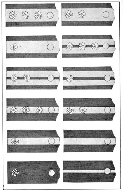 In the United States Army and Marine Corps the prevalent color for the field service uniforms is some shade of the dull brown commonly known as “khaki,” and the bright gilt and silver buttons, corps and regimental devices and numbers and belt buckles have been replaced to a great extent by dull bronze buttons and ornaments, insignia of rank for officers only being still made of silver and gold. [Pg 12]