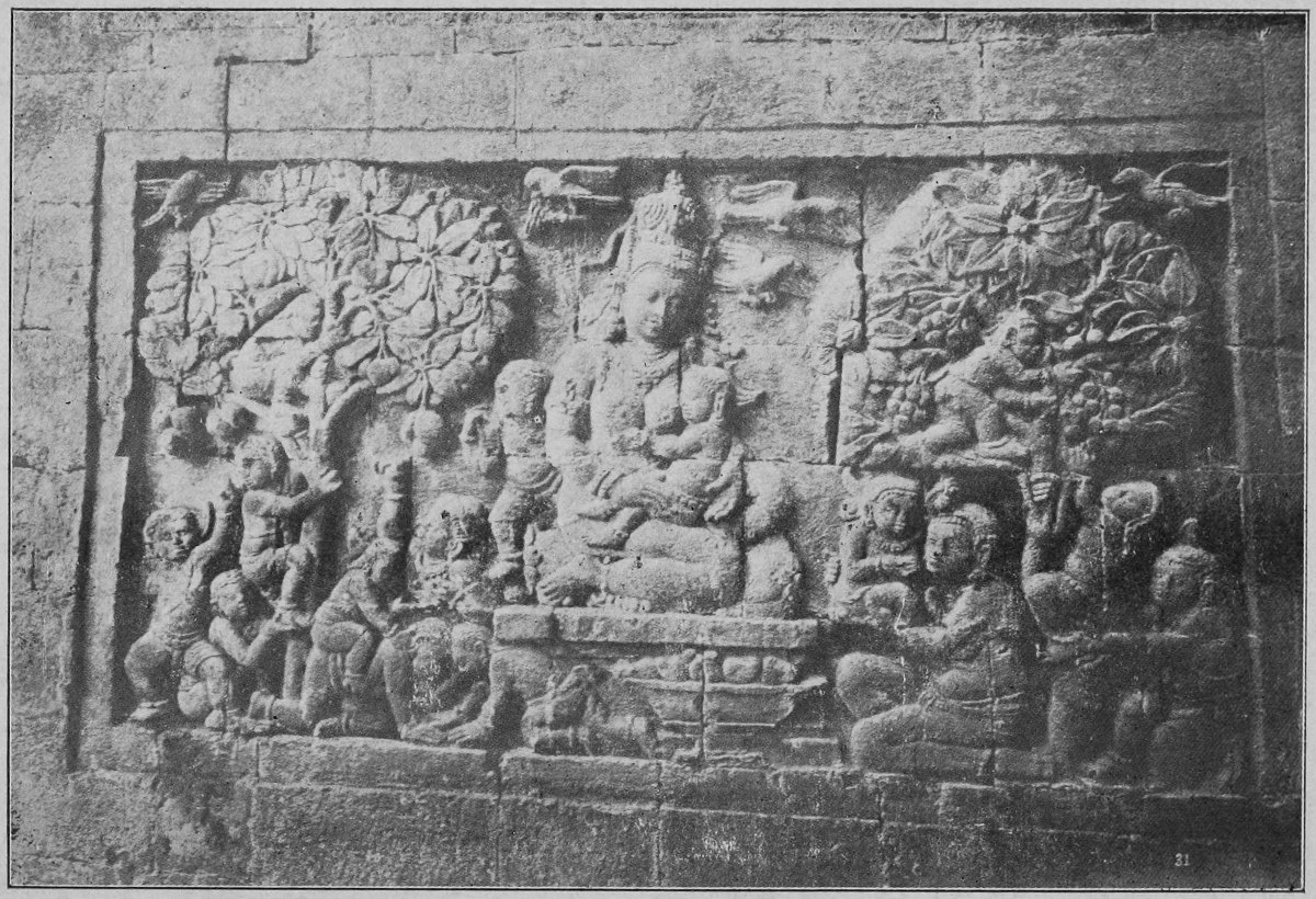 The two sculptures before the entrance show us, to the left, a princess in a garden of fruit-trees, with a suckling at her breast, and many playing children all round about her. And opposite to them, to the right, we see an Indian,—not buddhistic—prince with much more children in such another garden.