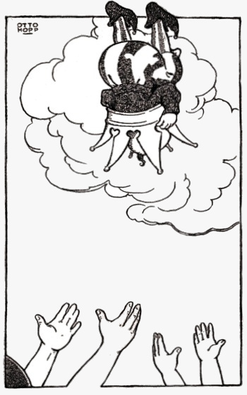 Leaping aboard the raft, they untied it, spread the sail, and amid the shouting of the courtiers, the ringing of the Court Crier's bell, the bellowing of the snap-dragon and the barking of the dog-fish, away they sailed and soon were lost to sight in the cloud-wall.