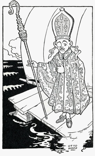 Slowly the raft glided forward, until it presently bumped gently against the pier, when the frisky Archbishop, using his crozier as a jumping pole, leaped lightly upon the steps, and running up them with hand extended, he cried:
