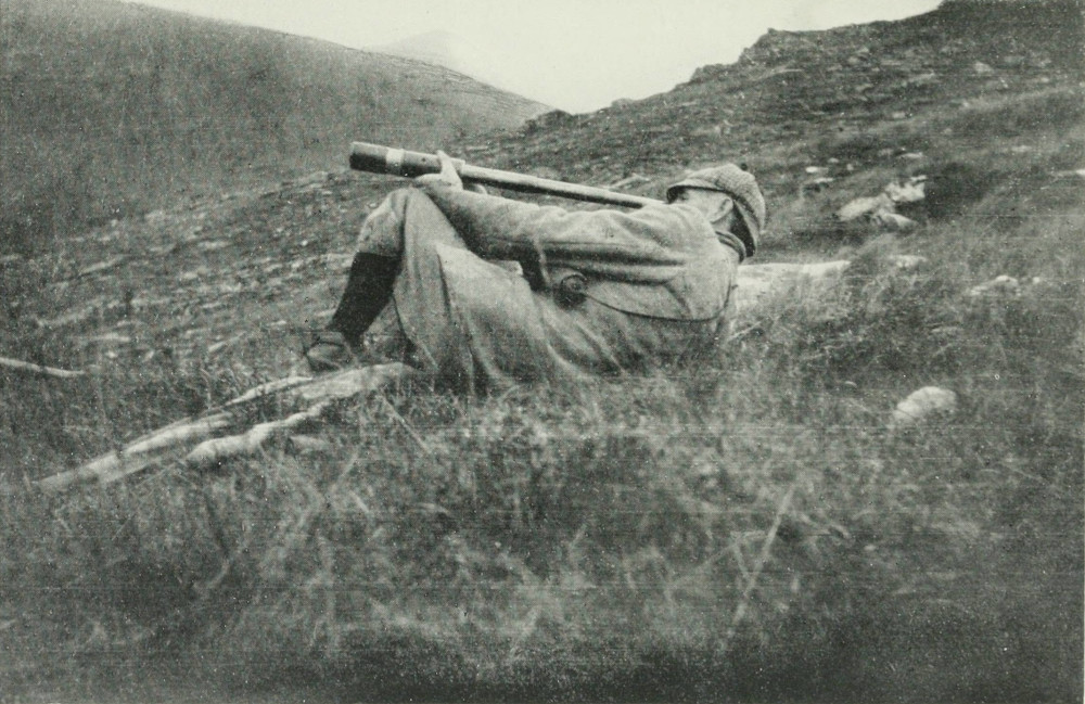 We then stalked the stags and managed to get within about 120 yards of them. As soon as I[213] got a good view of the beasts I noticed that the stag with one horn was limping slightly, and it flashed through my mind that he was almost certainly the stag which I had wounded in the previous season, particularly as he was the same colour and the horn seemed to me to be very similar to what I recollected of the horns of the wounded stag. Whilst these thoughts were rapidly passing through my mind, Sandy whispered, “Don’t take the stag with one horn, sir, but the yellow stag on the right which is a much better beast.”