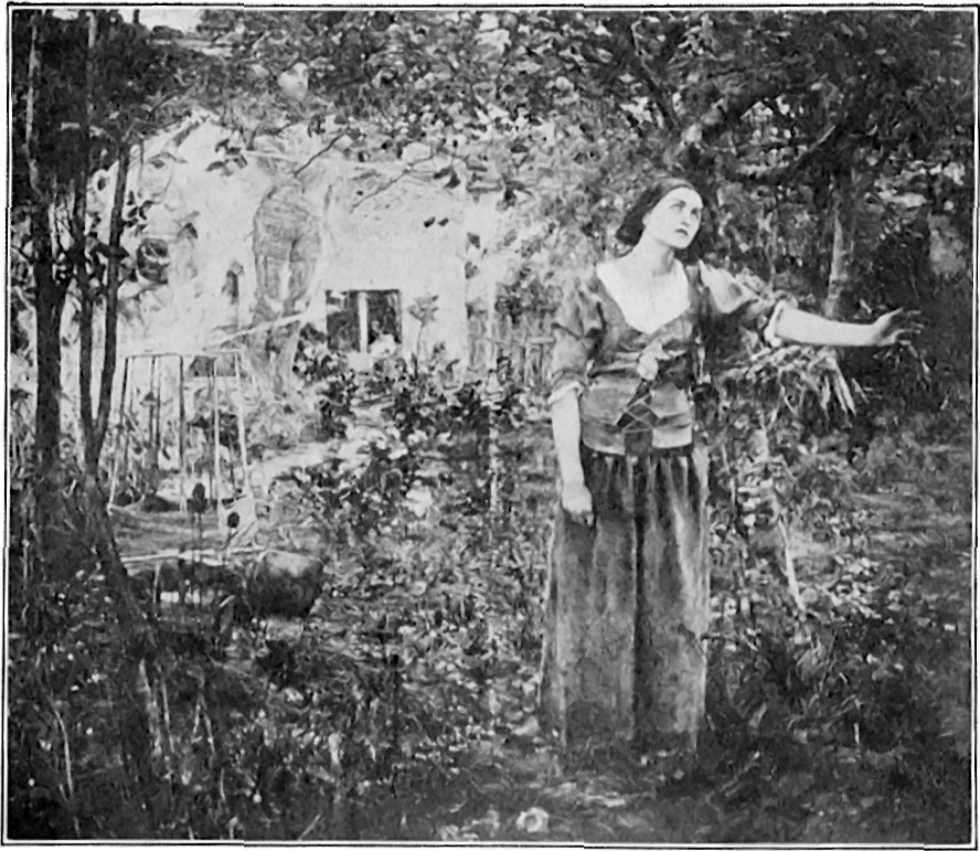 With its fruit trees, flowers, and vegetables, the French garden represented in the picture was painted from nature. In the distance we see a suggestion of the great forest in which Joan used to wander in solitude and prayer. A simple peasant girl, poorly dressed, there is little about her to please or attract us until we look at the eyes. Then we begin to understand why this picture is considered a masterpiece. Those great, far-seeing, melancholy eyes seem to look far beyond us, and their ecstatic gaze inspires us with some of that same confidence in her which so possessed her soldiers.